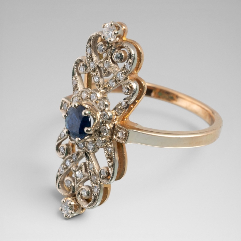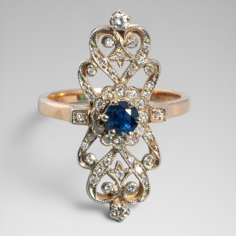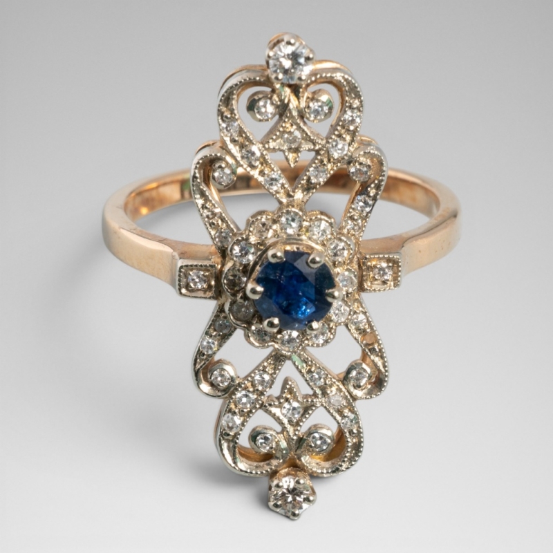 En argent sur or jaune 18K (750) ornée d'un motif de volutes entrelacées, serti de diamants taille ancienne, centré d'un saphir rond facetté.