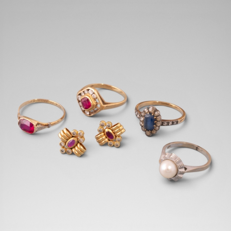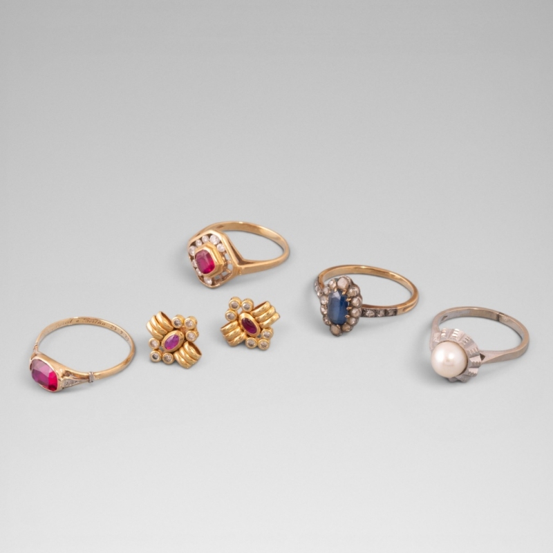 Réunion de quatre bagues et d'une paire de boucles d'oreilles