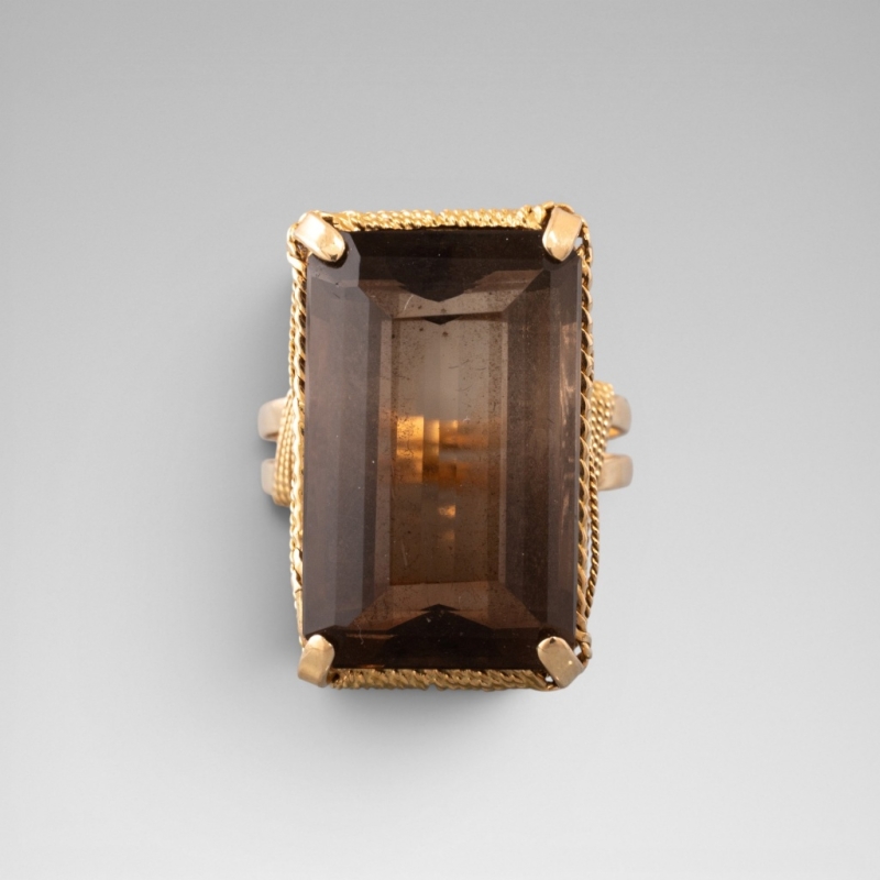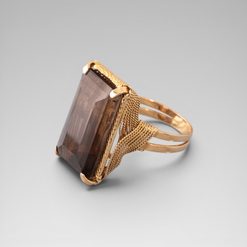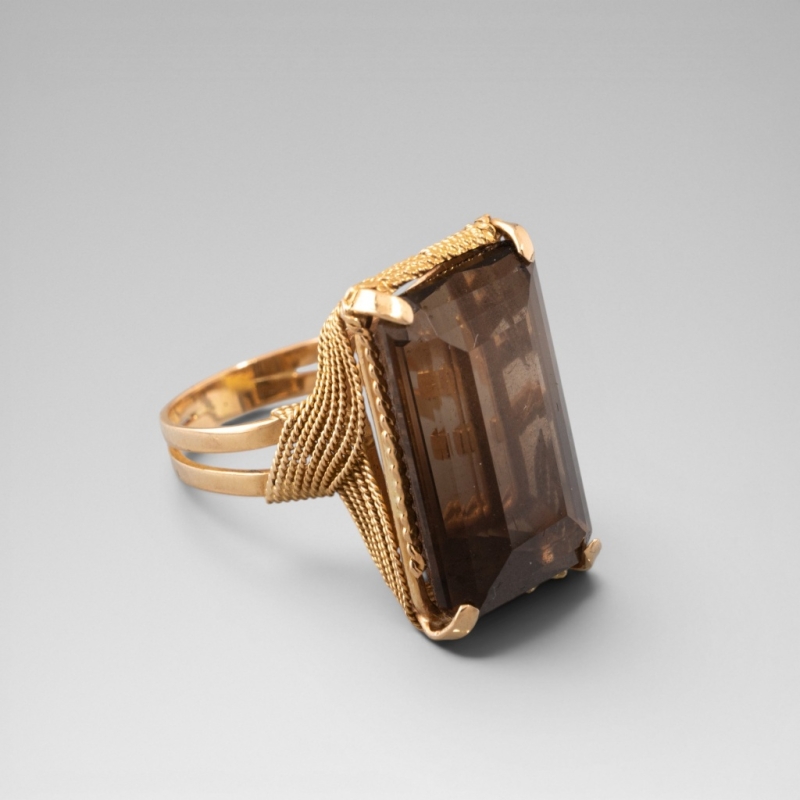 En or jaune 18K (750) centrée d'un important quartz fumé taille émeraude retenu par un entrelac de fils d'or tressé.