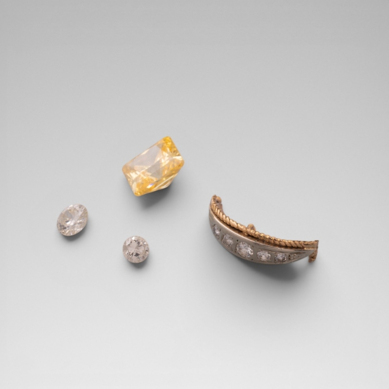 Réunion d'un élément or diamanté, deux diamants et une pierre de synthèse