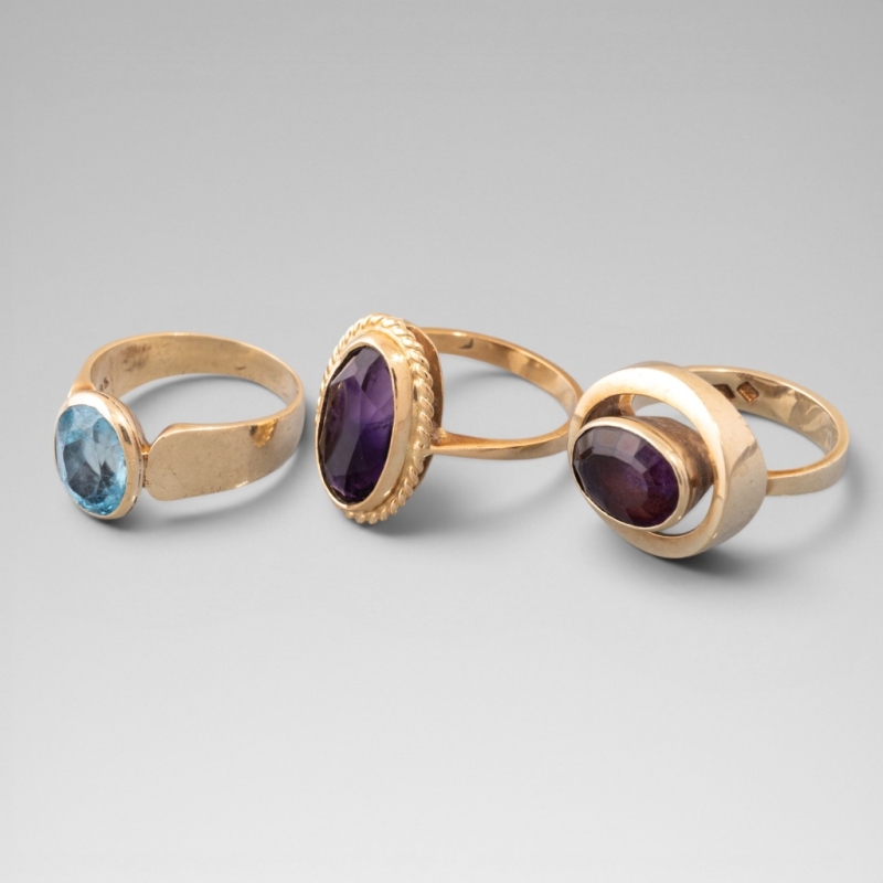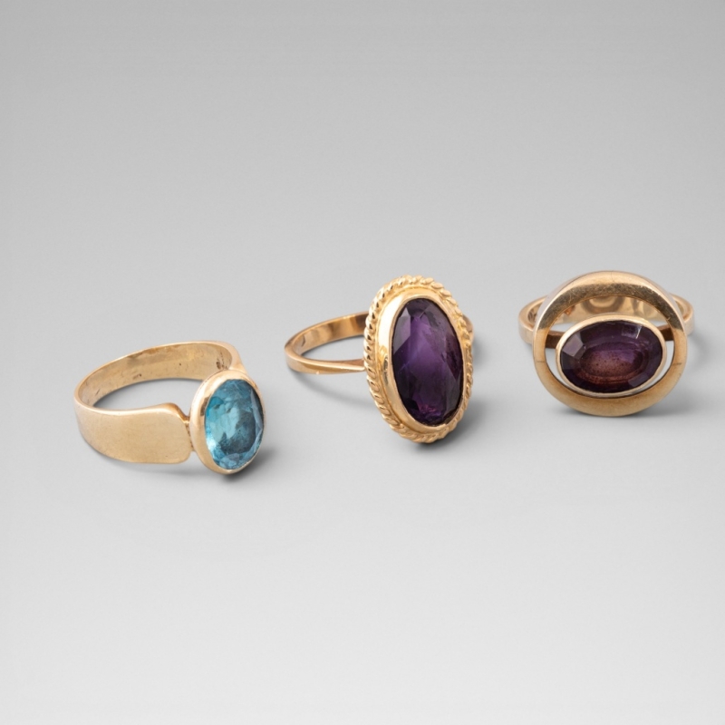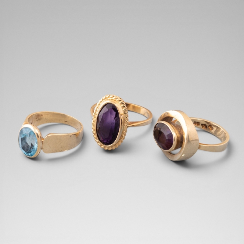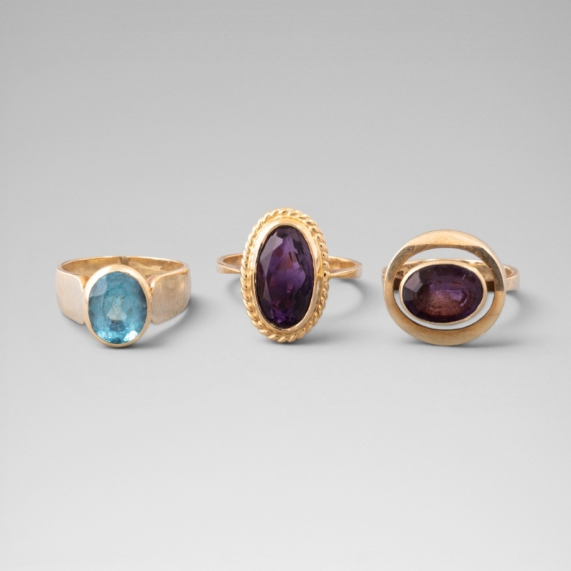 Une bague moderniste en or jaune 14K (585) sertie d'une améthyste ovale facettée soulignée d'un large anneau détaché du centre créant ainsi relief et profondeur.