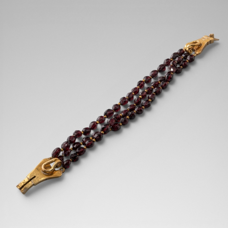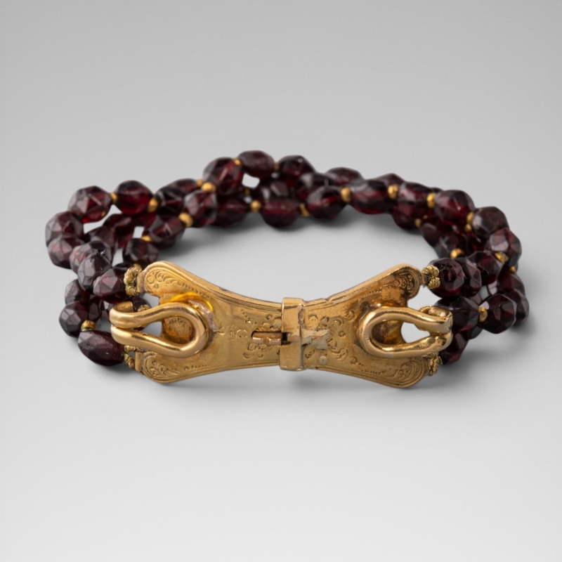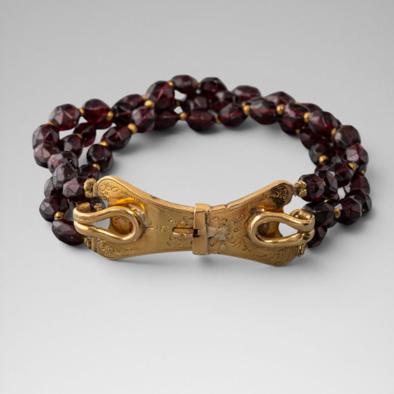 bracelet triple rangs de perles de grenats facettées doté d'un important fermoir très décoratif en or jaune 18K (750) ciselé de motifs floraux et volutes.