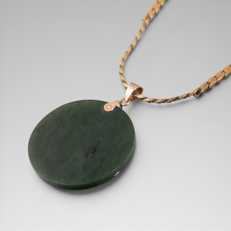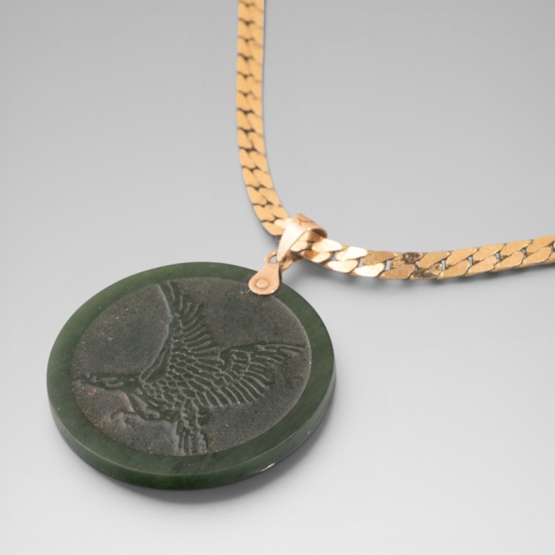 Médaillon en jade orné d'une bélière en or jaune 14K (585), gravé en bas-relief sur l'avers d'un aigle en plein vol, attaché à une chaîne en or jaune 9K (375) à mailles anglaises aplaties.
