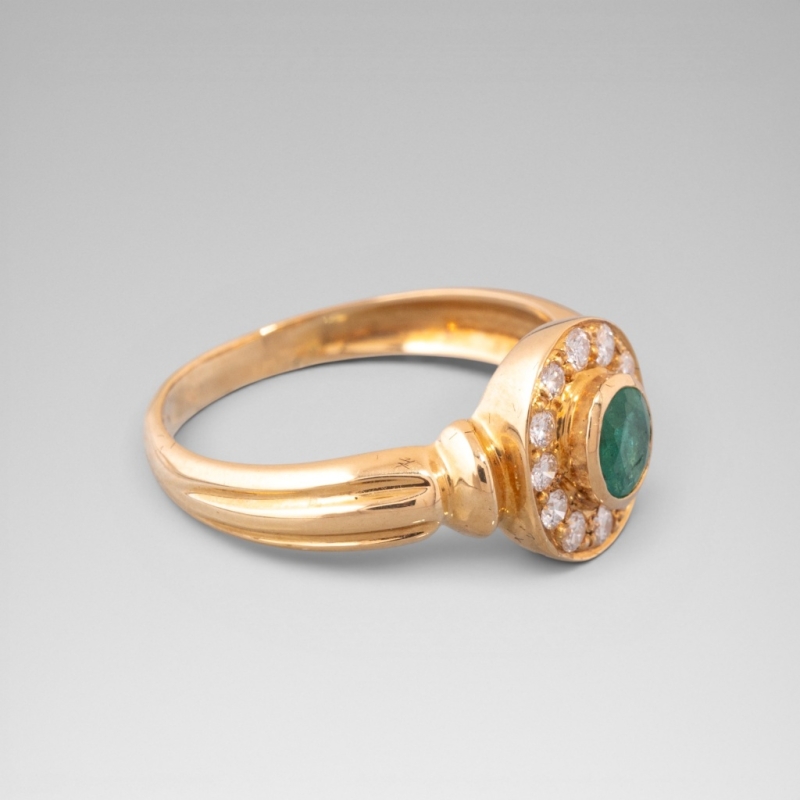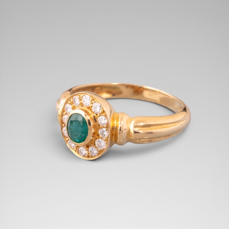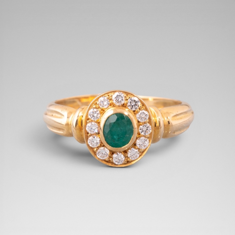 monture godronnée en or jaune 18K (750) au centre serti d'une émeraude taille ovale entourée de quatorze petits diamants taille brillant.