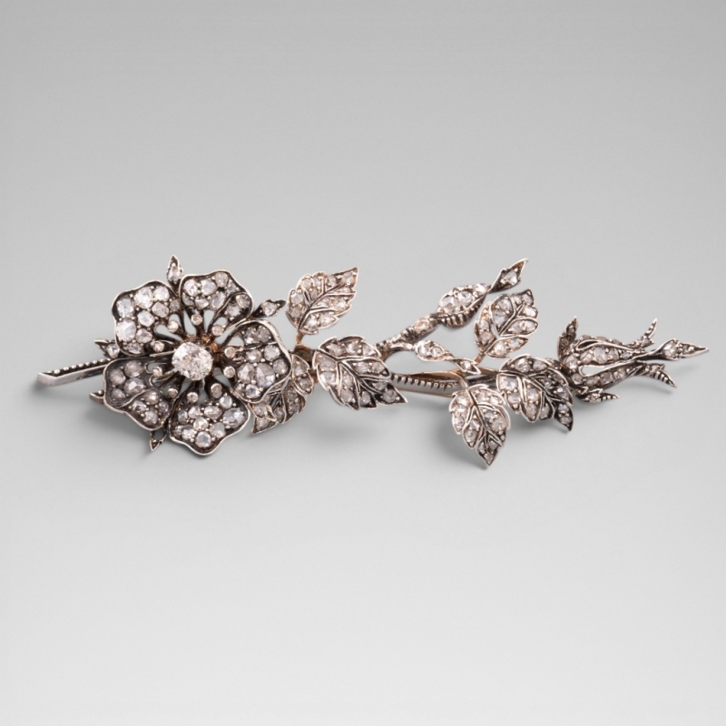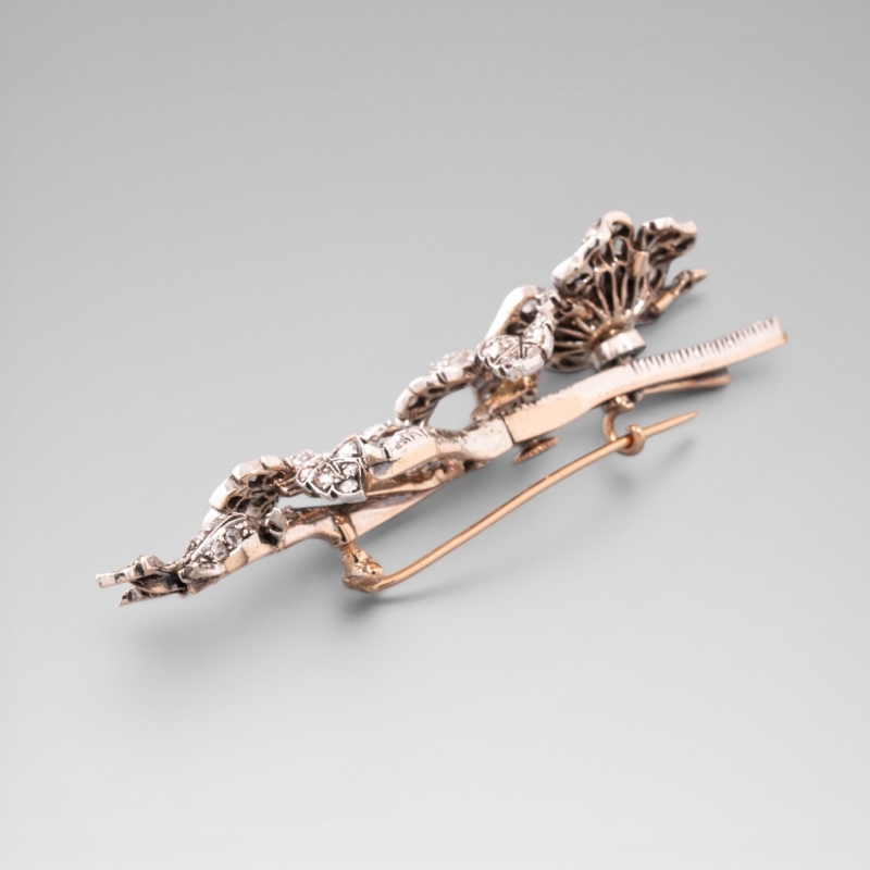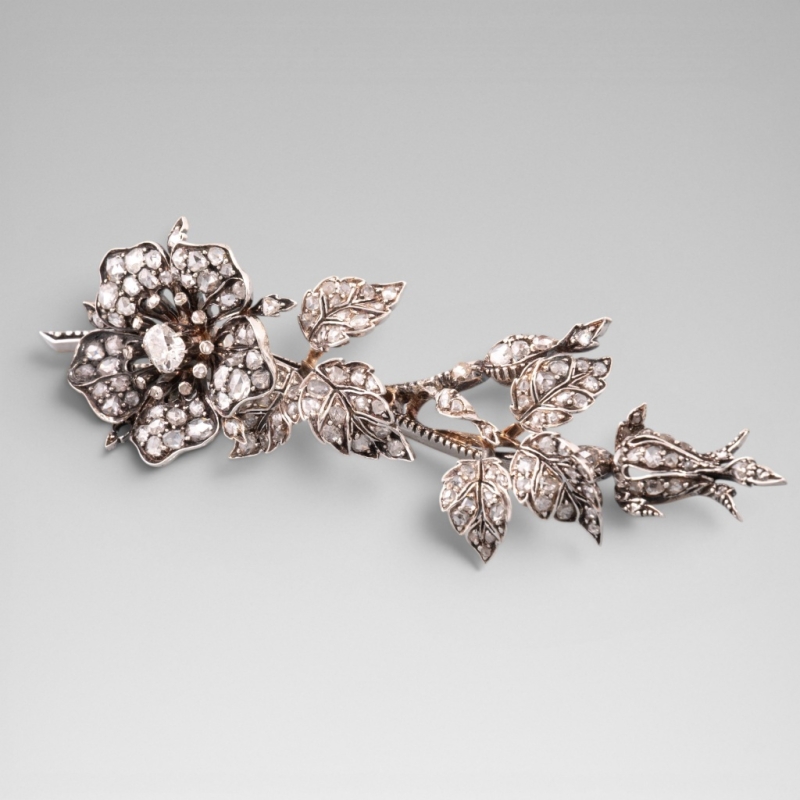 Monture argent sur or rose 18 Kt (750) entièrement sertie de diamants taille rose figurant une fleur sur une branche feuillagée.