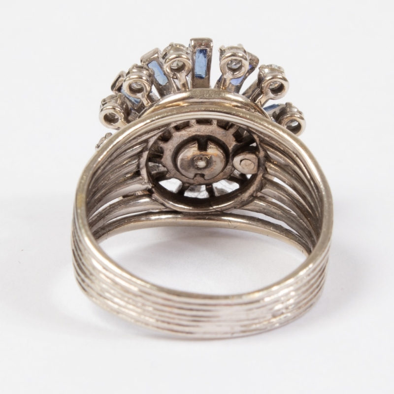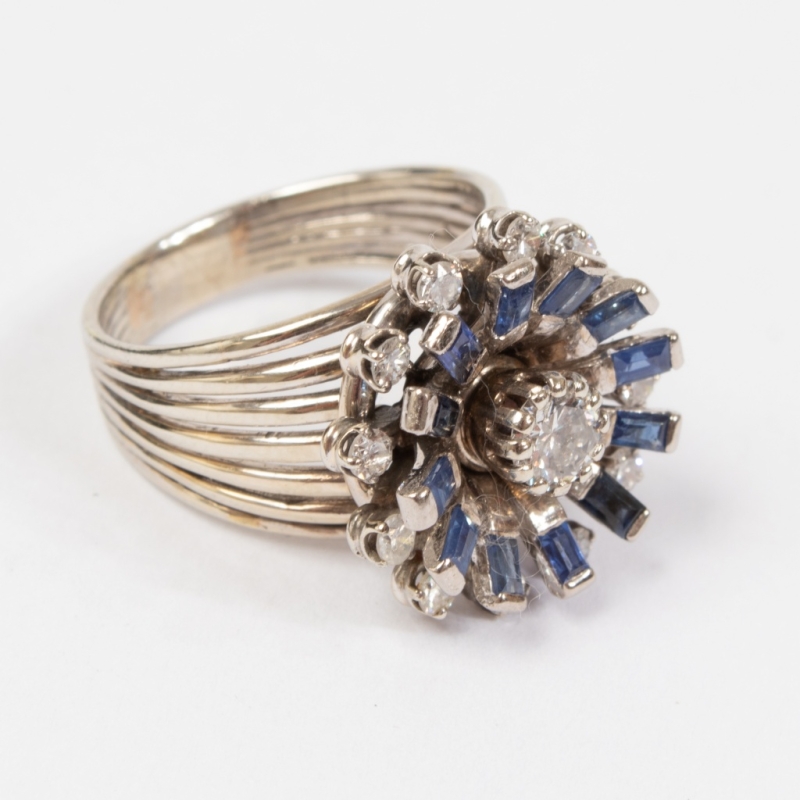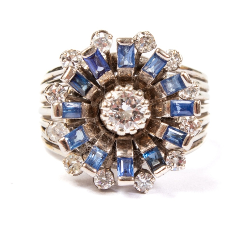 En or blanc 18K (750) sertie d'un diamant taille brillant entouré d'une corolle de saphirs taille baguettes ponctués de petits diamants taille brillant.