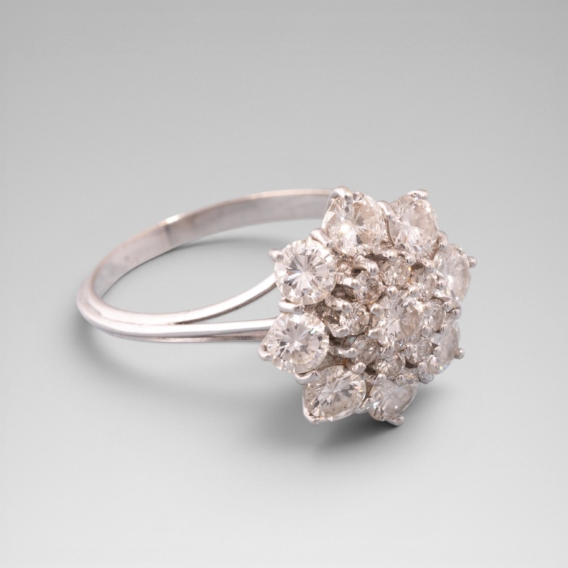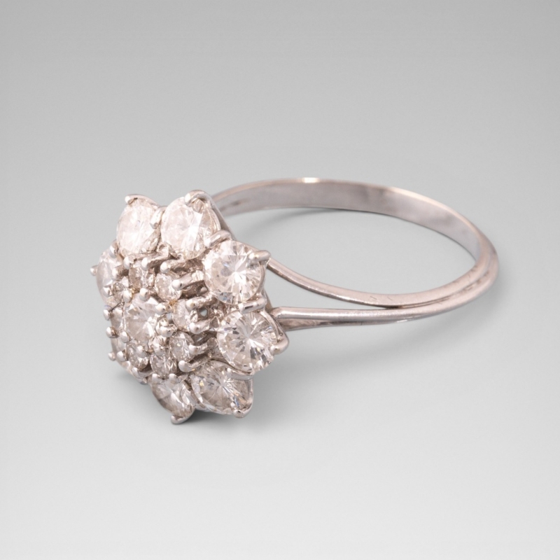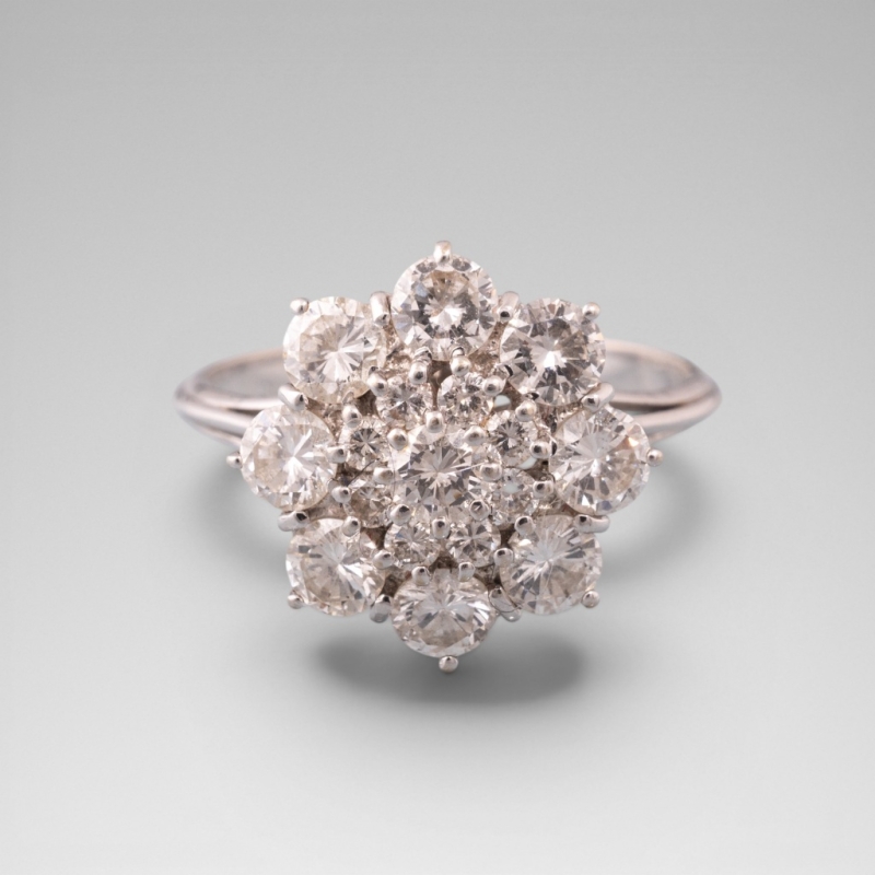 En or blanc 18K (750) centrée de petits diamants taille brillants disposés en forme de fleur, elle même entourée d'une corolle de diamants taille brillant plus importants.