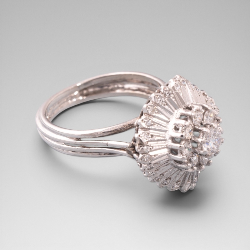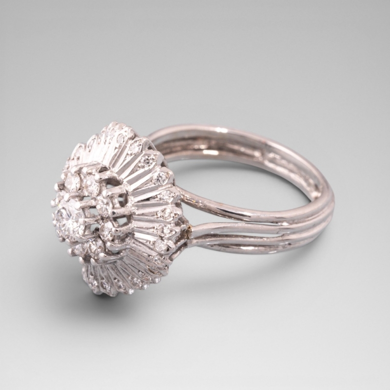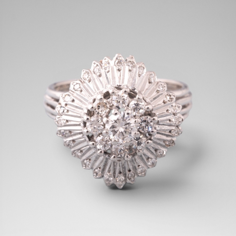 en platine centrée d'un dôme serti de diamants taille brillant entouré d'une corolle " illusion " ponctuée d'éclats de diamants créant un effet optique du plus bel effet.