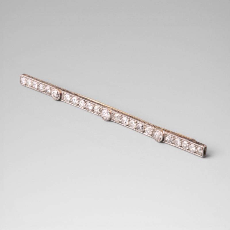 platine sur or jaune 18K (750) ornée d'une ligne de diamants taille ancienne sertis mille grain, ponctuée de trois diamants de diamètre plus important répartis à distance régulière.