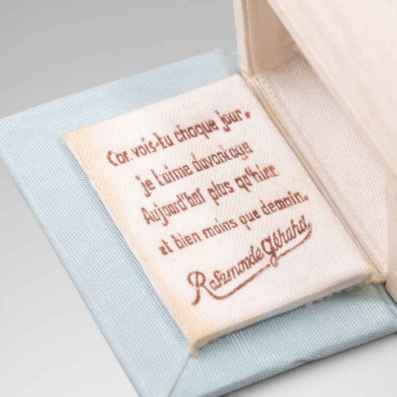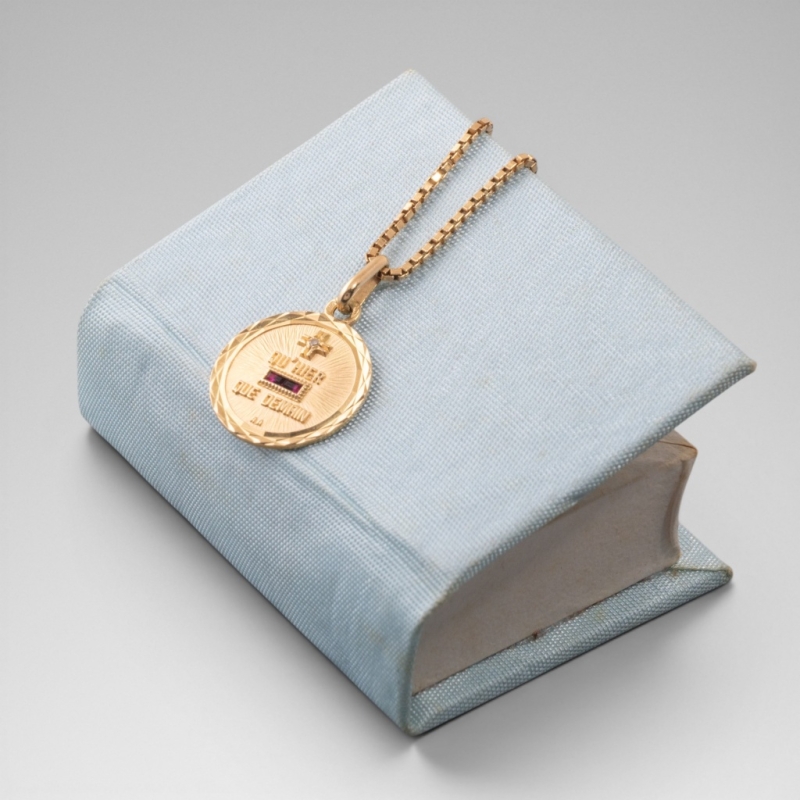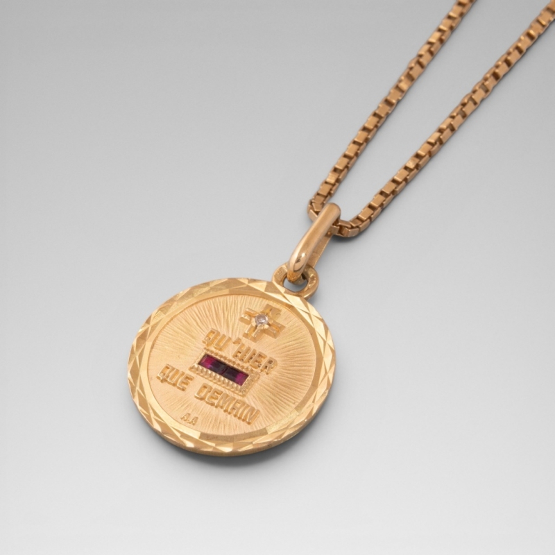 Médaille en or jaune 18K (750) à bordure facettée, au centre texturé et gravé du célèbre vers du poème de Rosemonde Gérard à son mari Edmond de Rostand : + qu' hier et - que demain suspendue à une chaîne en or jaune 18K (750) à maille vénitienne.
