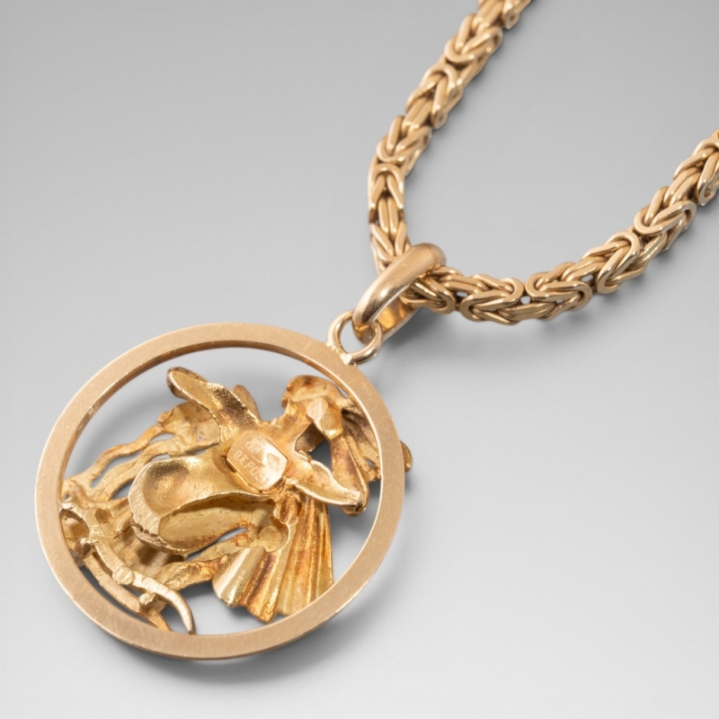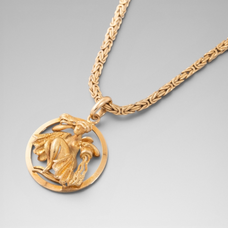 en or jaune 18K (750). Chaîne à mailles royales à laquelle s'attache un pendentif zodiacal figurant le signe du verseau.