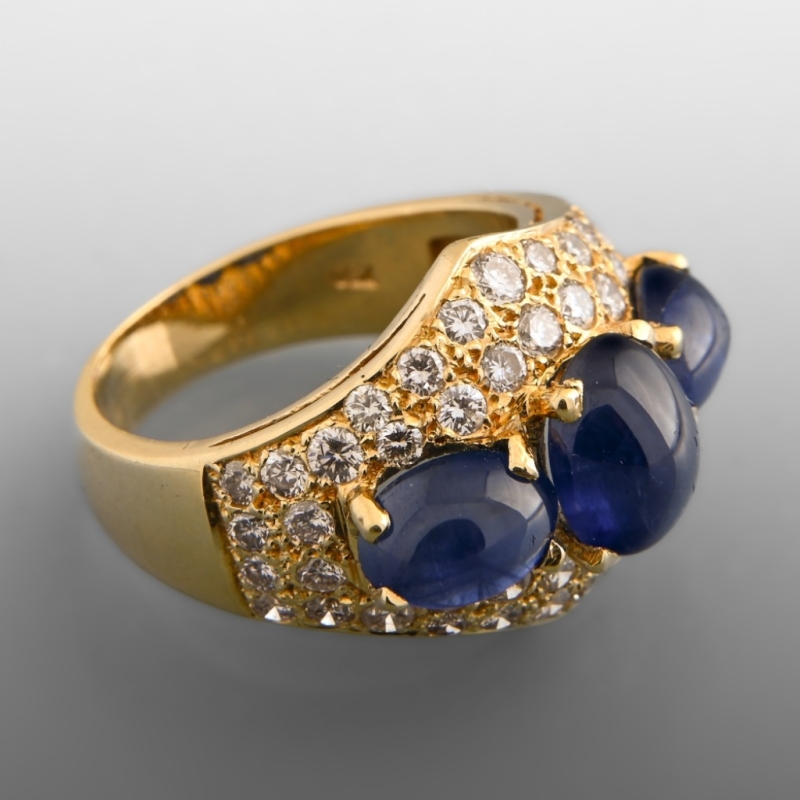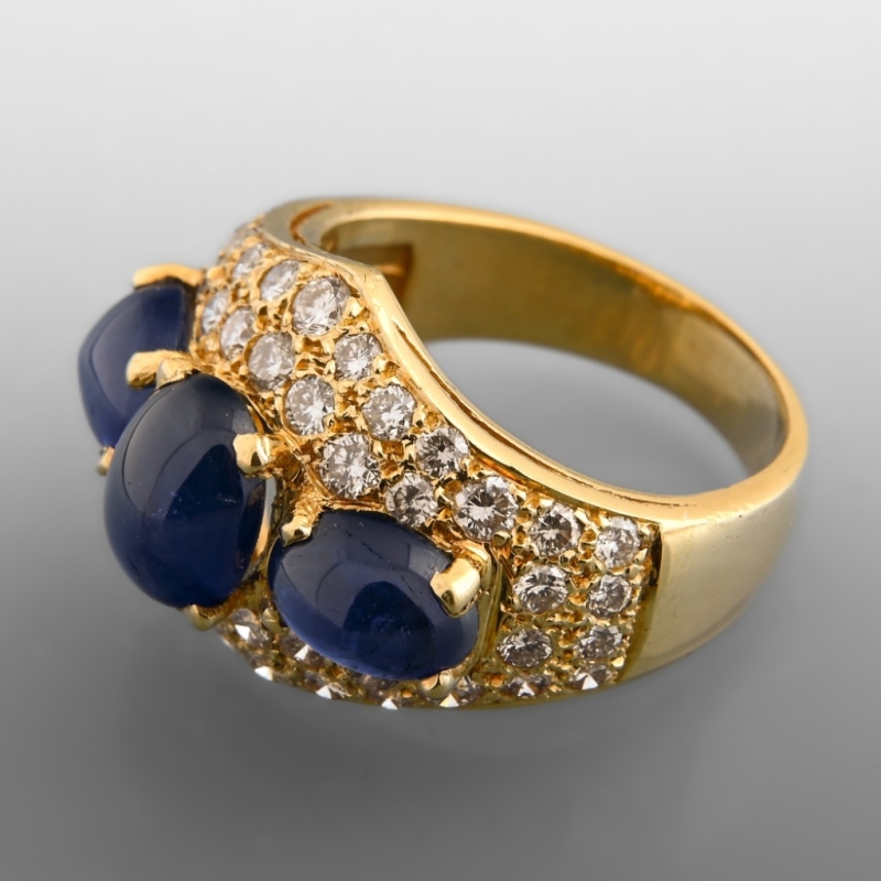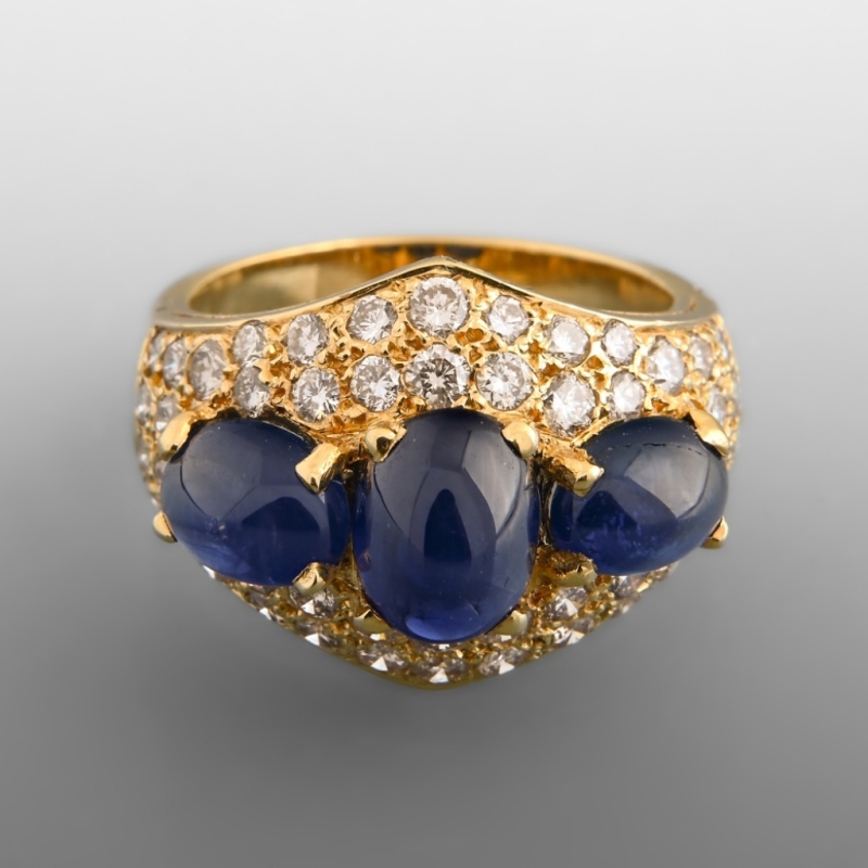 En or jaune 18 K (750) sertie d'un pavage de diamants taille brillant surmonté de trois saphirs taille cabochon.