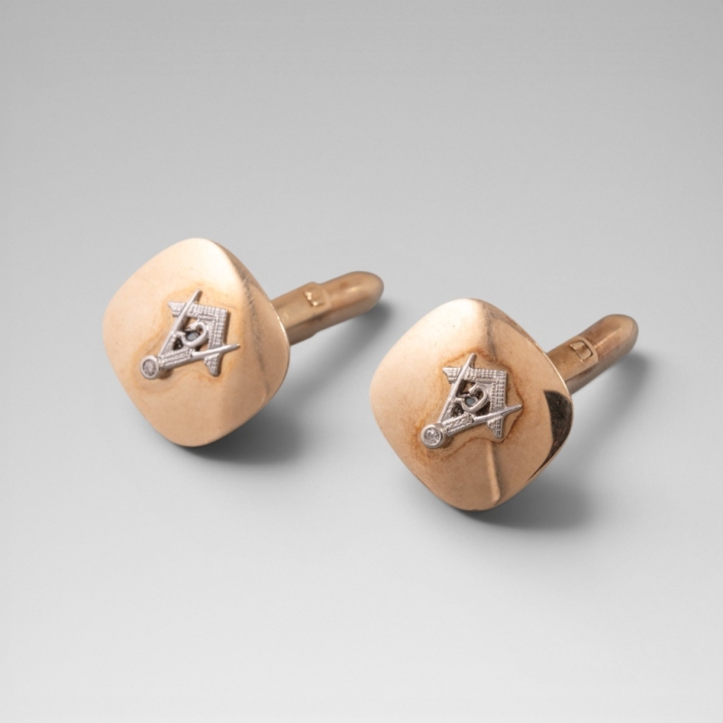 De forme coussin à pans coupés en métal doré, plateaux légèrement bombés, finement sculptés d'un décor maçonnique appliqué en or gris représentant l'équerre et le compas entrelacés avec la lettre G au centre symbole de la géométrie ou de la gnose.