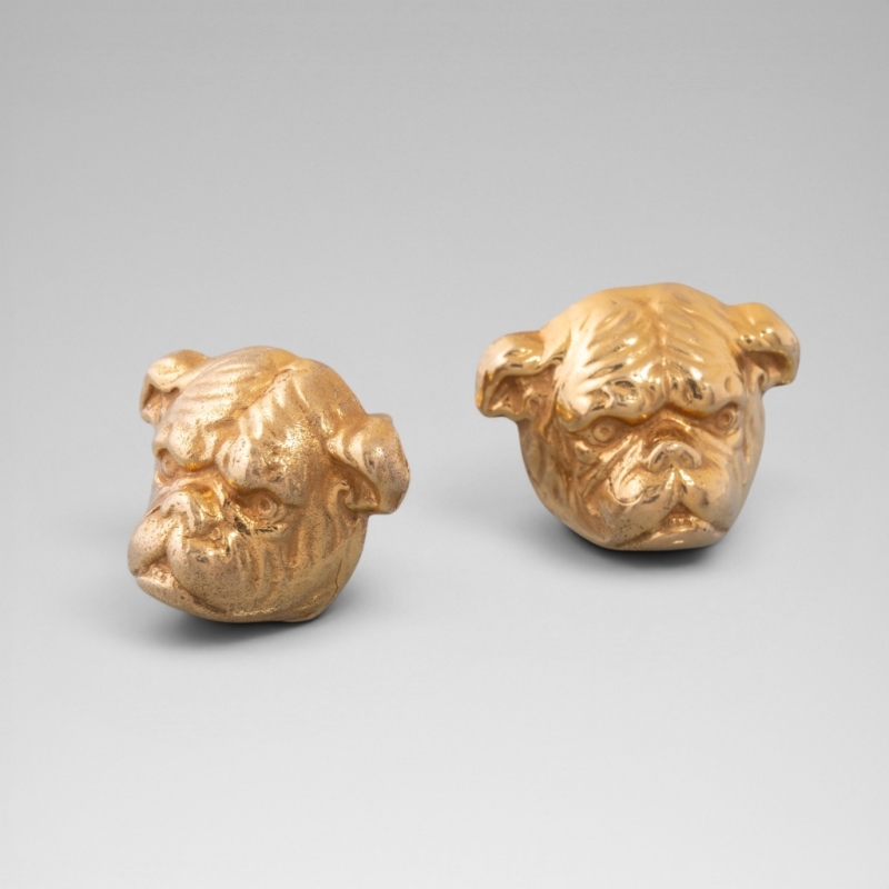 Elégante paire de boutons de manchettes figuratifs en or jaune 18K (750) représentant des têtes de bouledogues, fixations pivotantes.