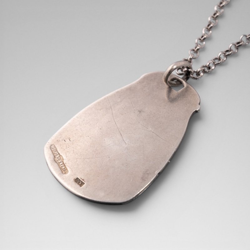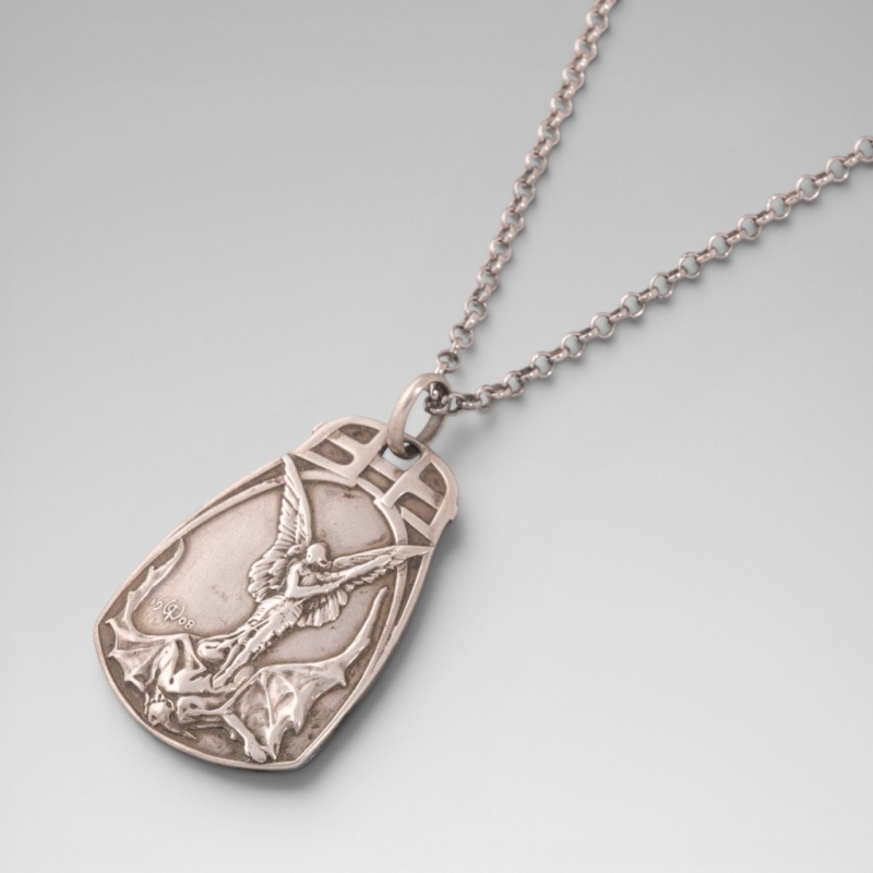 Médaille en argent datée 1908 de forme écusson finement ciselée de l'Archange Saint Michel terrassant le dragon. On y retrouve les lignes fluides et le répertoire floral propre à cette époque.