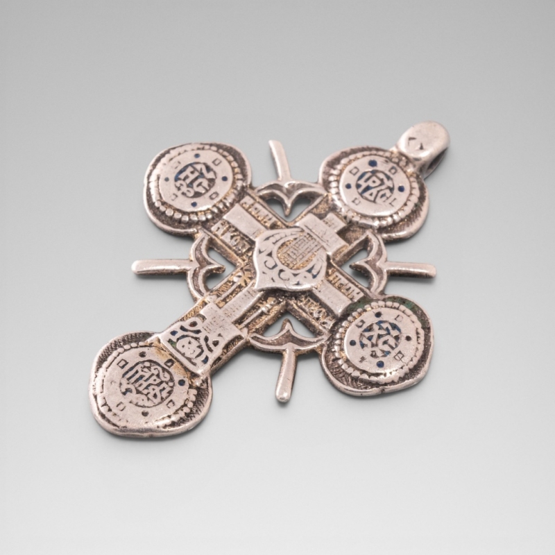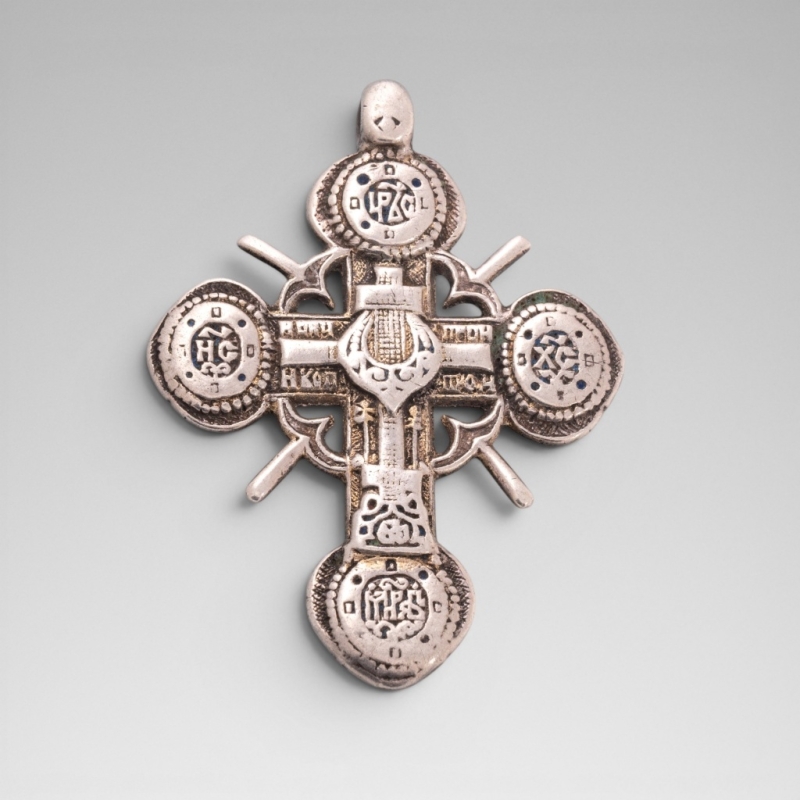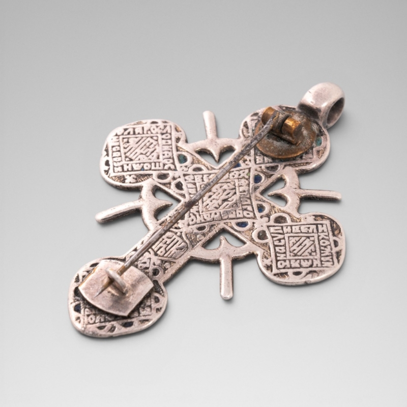 En argent, pendentif -broche figurant une croix orthodoxe russe à lobes au centre de laquelle on retrouve les barres diagonales représentant la croix de saint André, saint Patron de Russie.