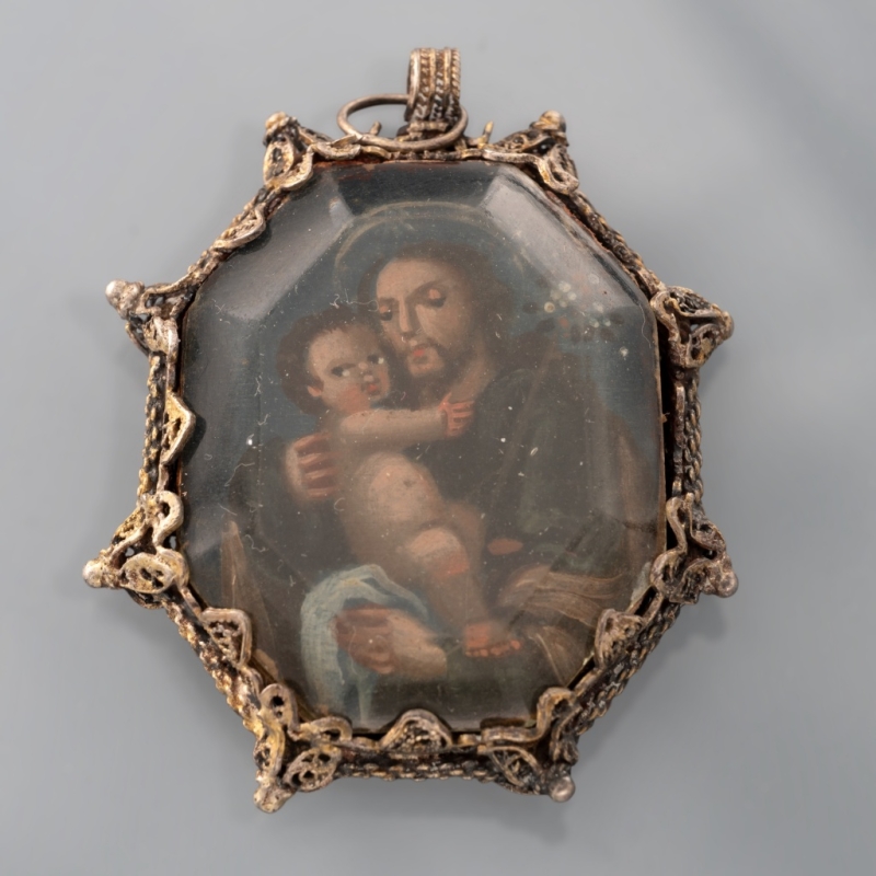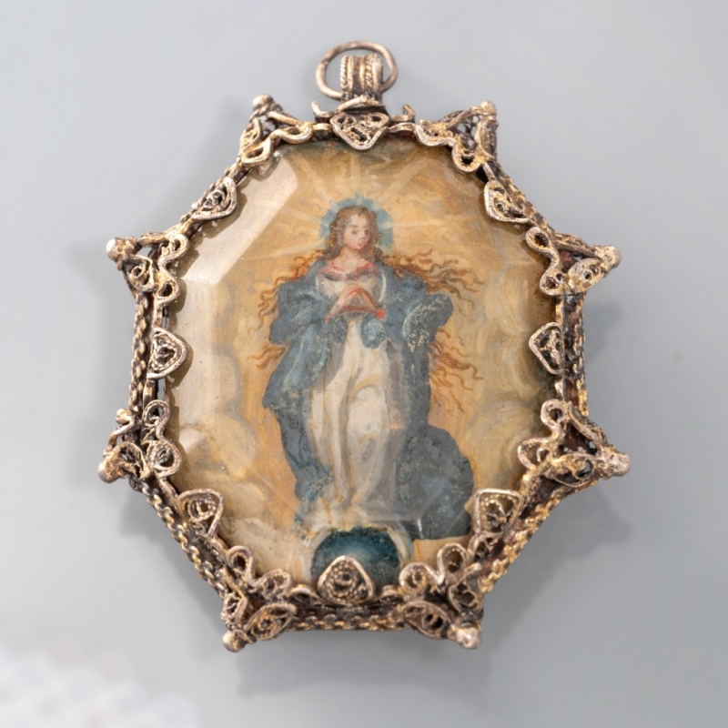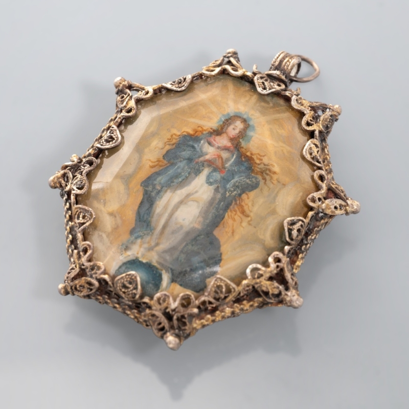 en cristal de roche et argent filigrané anciennement doré, présentant sur une face une miniature de la Vierge en majesté et sur l'autre Saint Antoine et l'enfant Jésus.
