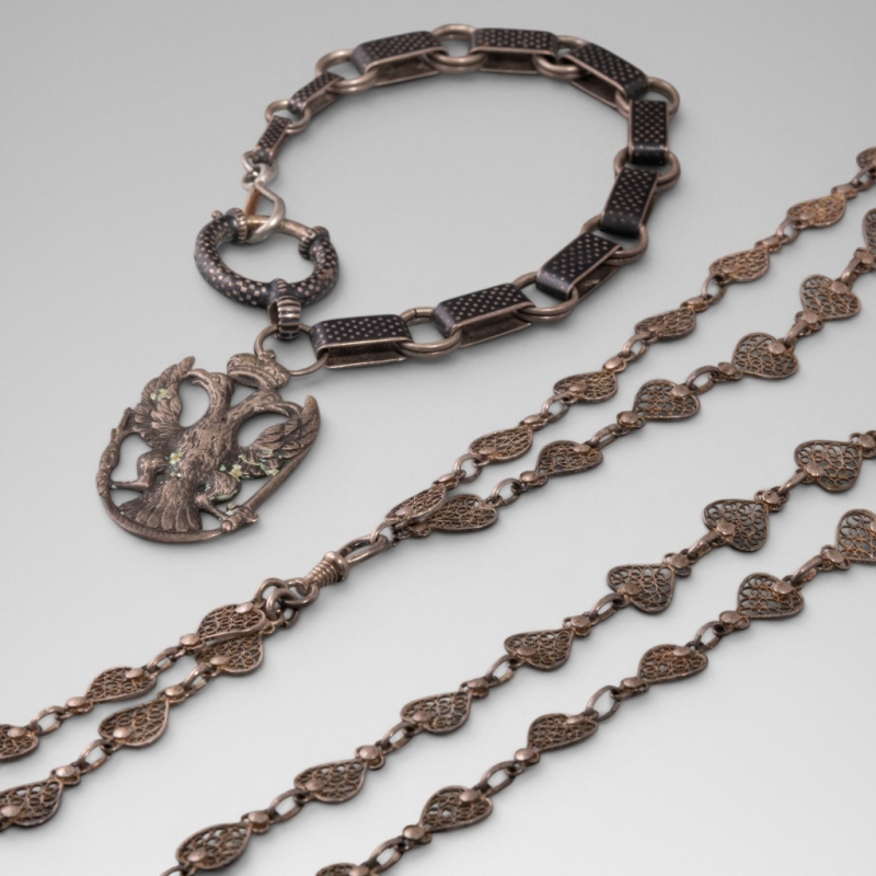 on y joint un bracelet en métal niellé à pendentif d'aigle bicéphale en argent