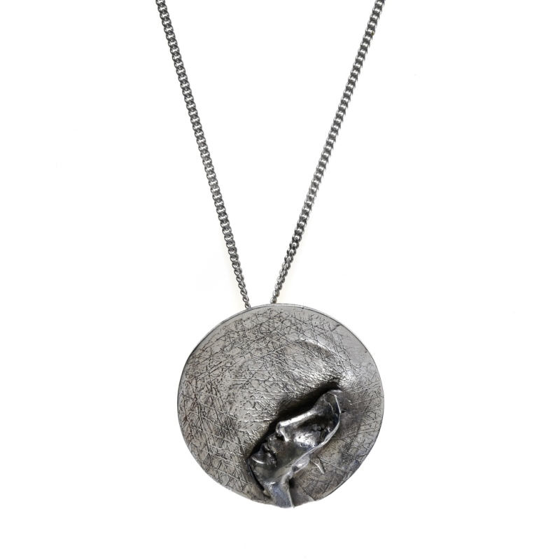 En argent, figurant une partie de visage de profil incrustée dans un disque texturé. Travail probablement belge des années 60/70. On y joint une chaîne en argent. Poinçon: aucun.