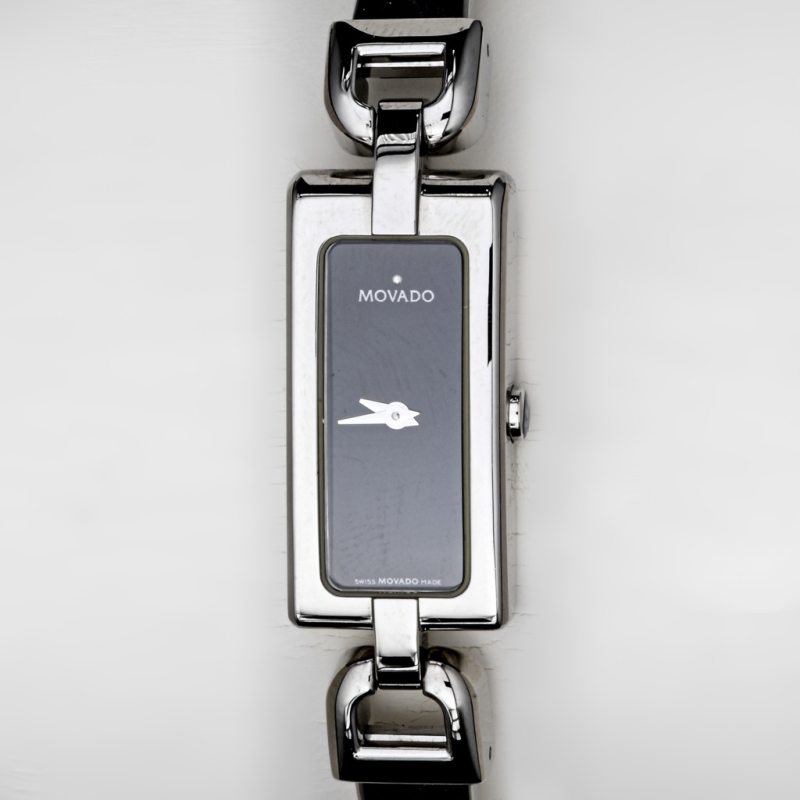 en acier. Cadran noir signé « Movado », « Swiss, Movado, Made » avec aiguilles dauphines.