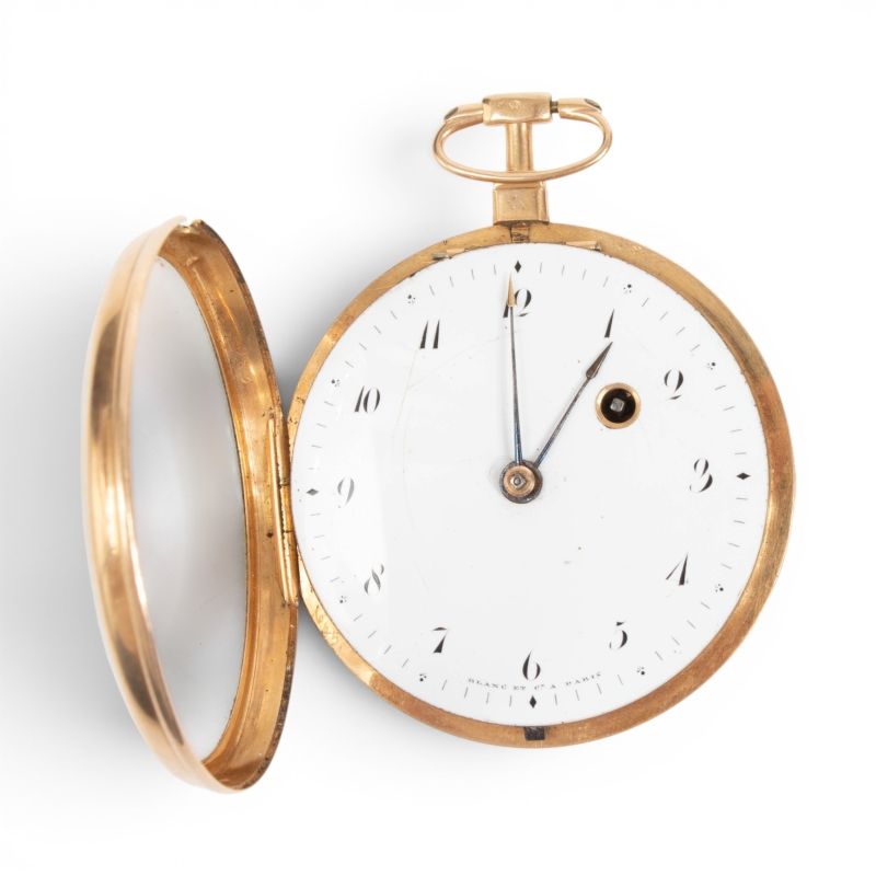 Mouvement : mécanique avec remontage à clef, balancier spiral avec coq, fusée et chaîne, disque de réglage avance et retard, signé et numéroté “Blanc et Cie à Paris no. 1468”