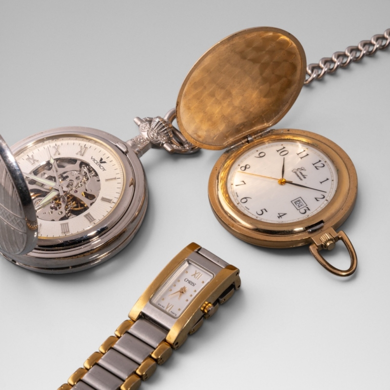 Une montre gousset squelette "Viceroy" en métal argenté, cadran à fond blanc, index chiffres romains et bâtonnets, mouvement visible à travers un fond transparent. Clapets avant et arrière godronnés et blasonnables. Montre fournie avec chaîne d'attache en métal. Mouvement quartz.