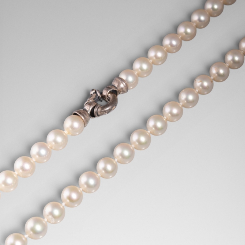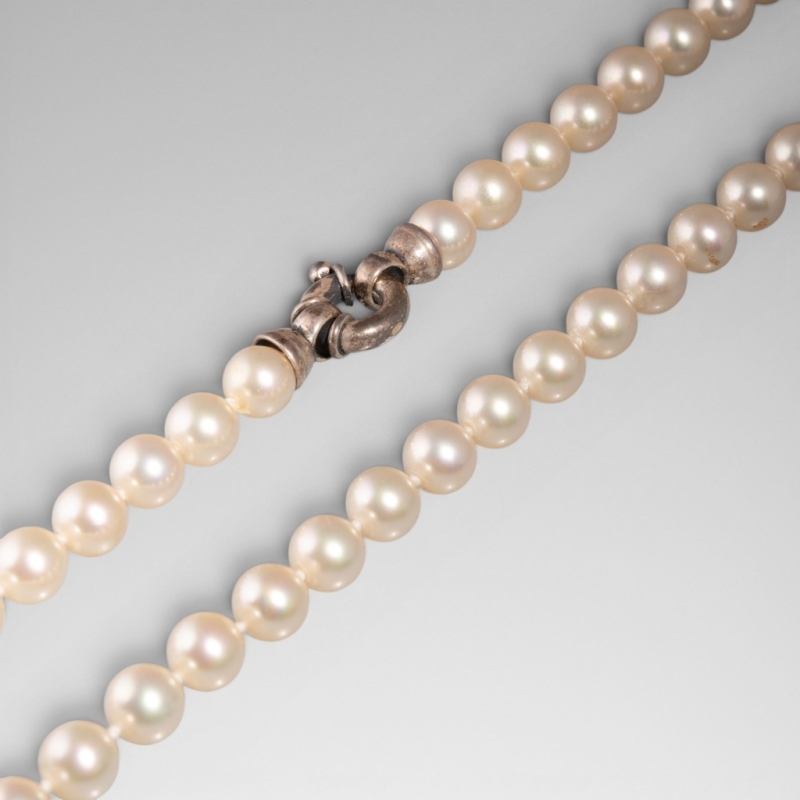 Long sautoir de perles blanches orné d'un fermoir bouée de marine en argent 925.