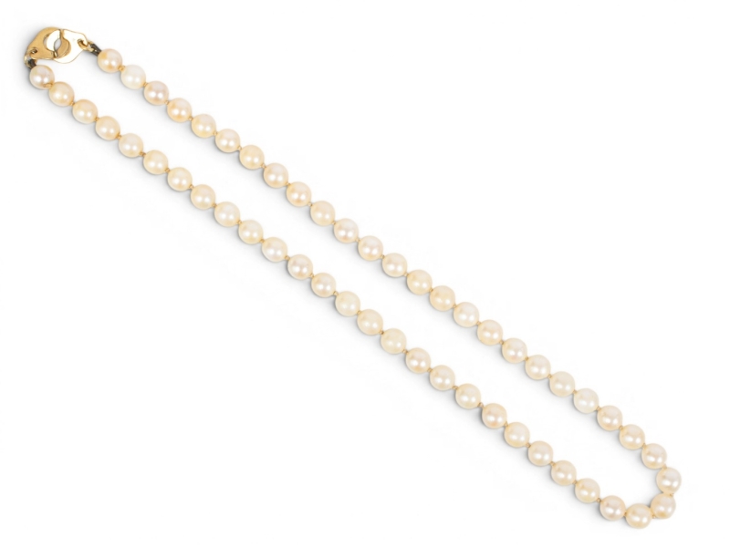 un rang de perles blanches muni d'un fermoir " menottes " en plaqué or.